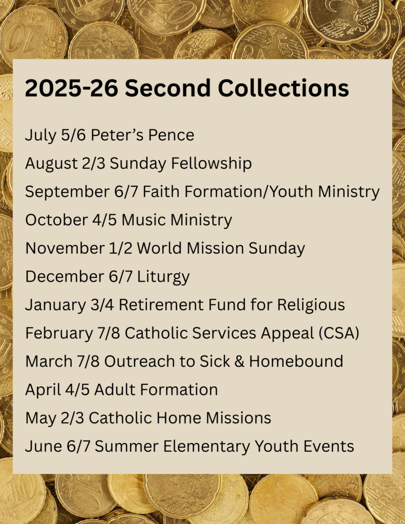 You can donate online through our portal powered by ParishSoft or you can download the Giving App. Get started today!